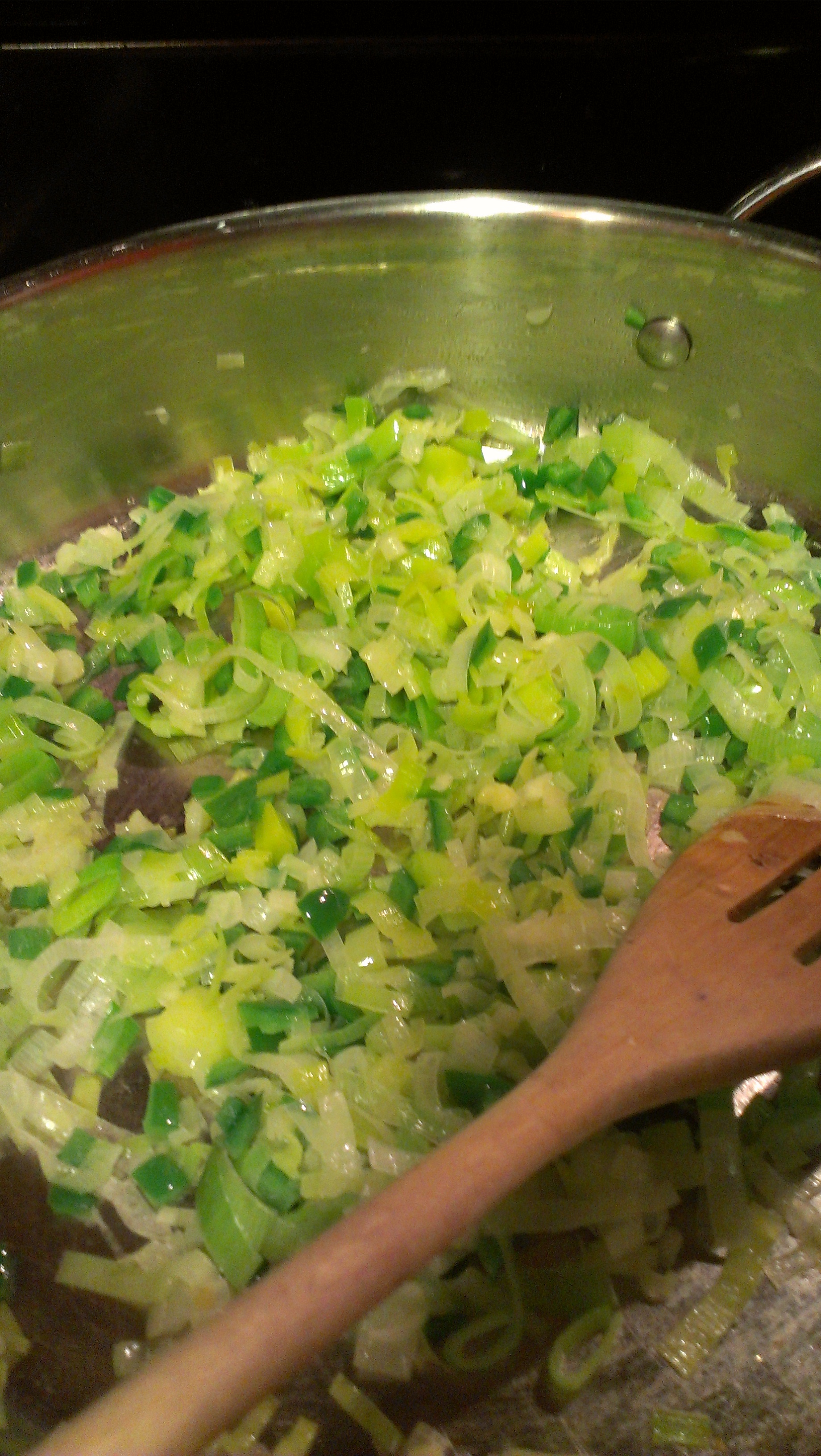 Saute leeks, garlic, and jalapeños