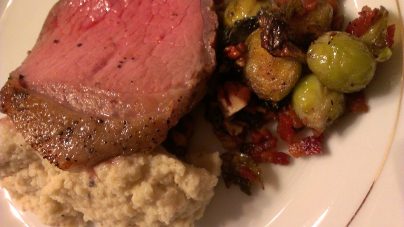 Eye round roast, roasted garlic cauliflower puree, and bacon pecan brussels sprouts