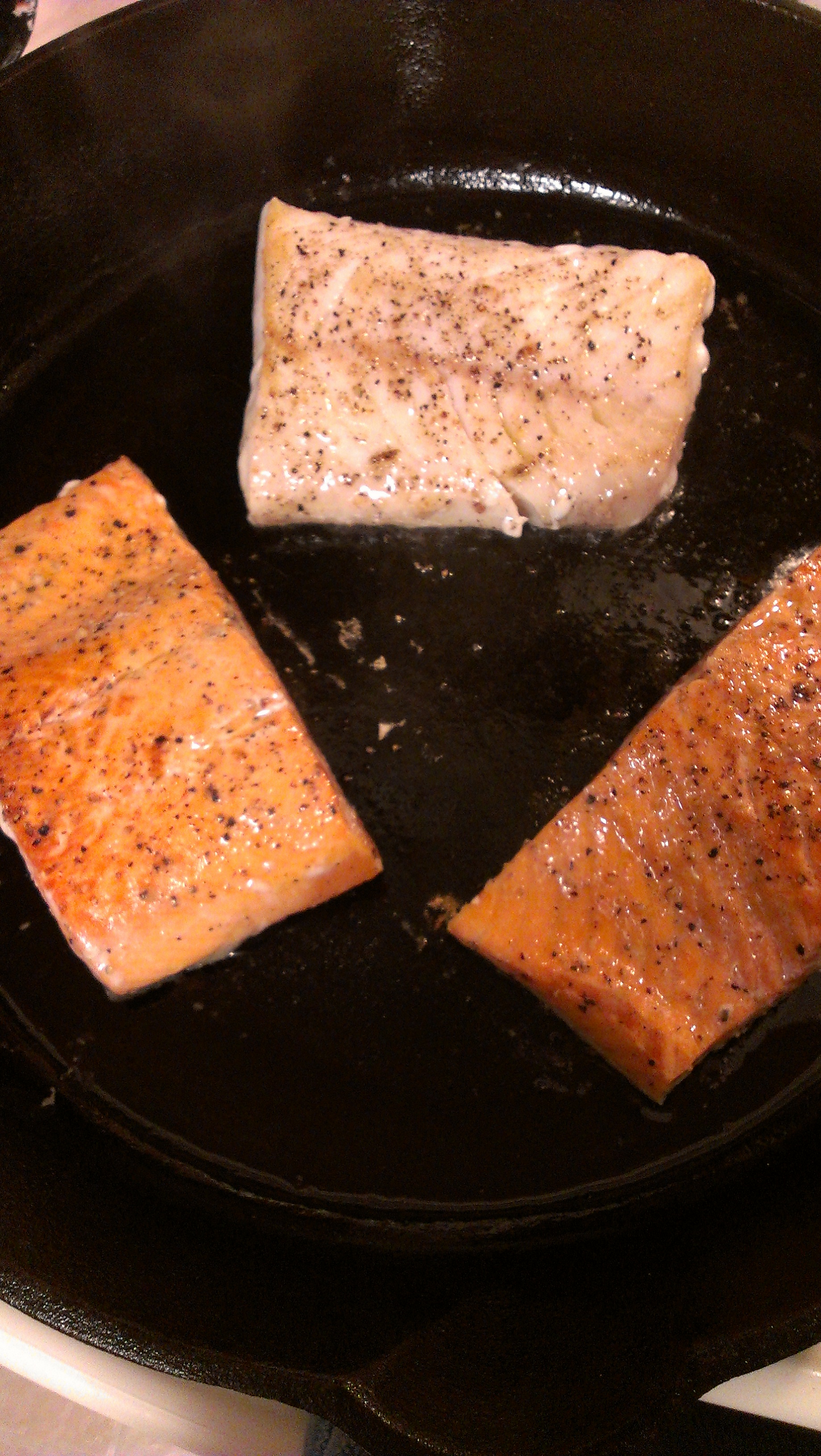 Finish off your wild fish (here cod and sockeye salmon) by steaming lemon juice in the pan.