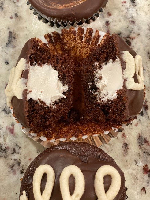 Combine dry. Combine wet. Mix dry into wet, distribute into lined muffin tins, and bake 375F for 22 minutes. When cool poke hole with wooden spoon handle and fill with marshmallow creme (below)